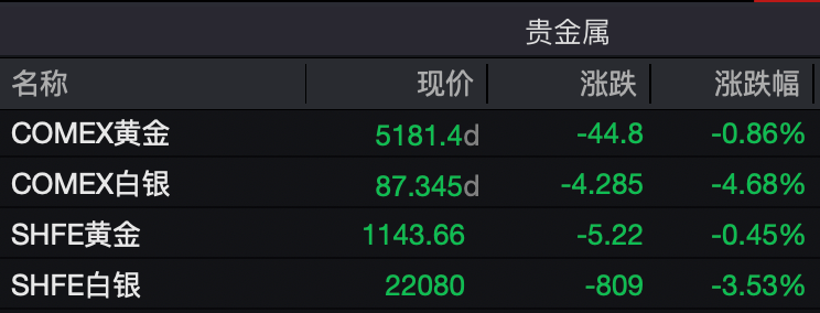 黄金、白银走低。完毕发稿,纽约期金跌幅为0.86%,报5181.4好意思元/盎司;纽约期银跌幅为4.68%,报87.345好意思元/盎司。国内期货夜盘开盘,沪金、沪银主力合约跌幅别离为0.45%、3.53%。