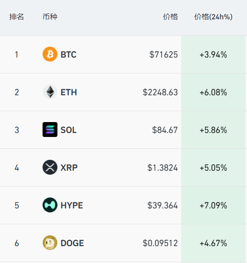 加密货币保握涨势,开云体育比特币涨近4%报71625好意思元/枚,以太坊涨超6%,SOL、XRP涨超5%,狗狗币涨超4%。往时24小时,全商场近12万东说念主被爆仓。