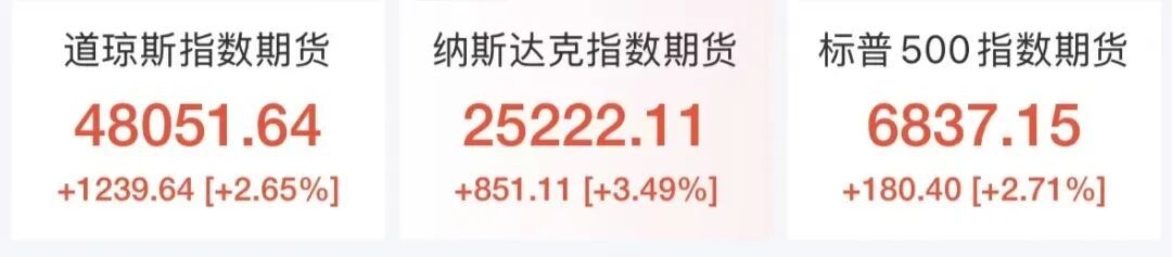 好意思股三大股指期货握续走高,说念琼斯指数期货涨2.65%,纳斯达克指数期货涨3.49%,标普500指数期货涨2.71%。