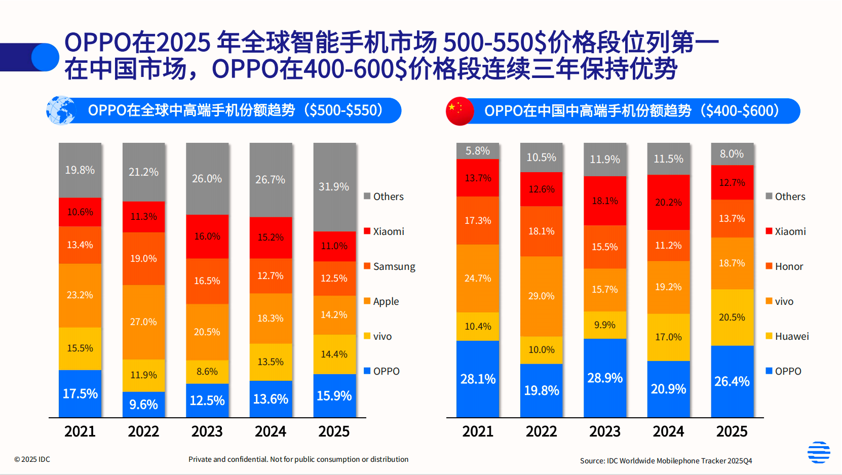 跟着Ultra系列出海程度的抓续加深,OPPO在公共市集的高端机型占比抓续栽种。字据巨擘市集调研机构IDC的数据清晰,2025年,OPPO在公共500好意思元~550好意思元价位段稳居第一,并以 284 好意思元的平均售价位列公共第三,高端化恶果日益显耀。更迫切的是,OPPO在国际市集正在完制品牌领会层面的质变,即从「性价比遴荐」向「高端可靠品牌」的领会跃迁,越来越多公共花消者将OPPO视为高端智高手机的可靠选项,而非性价比替代有计算。