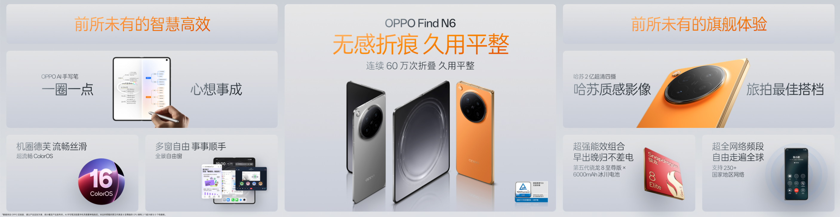 Find N6 的本领突破也很快获得市集和用户的招供。在首销当日,Find N6 创下京东、天猫双平台近一年全品牌、全样式折叠屏销售额记录,多家线下门店在首销当日接踵贴出售罄教导。口碑与销量的双重丰充,直不雅展现了Find N6的纷乱市集高唱力,也再次印证了 OPPO坚抓始终方针、打磨极致产物的策略定力。