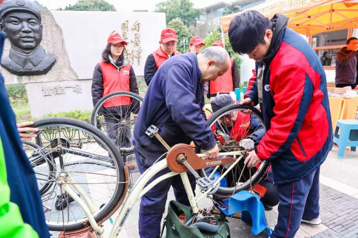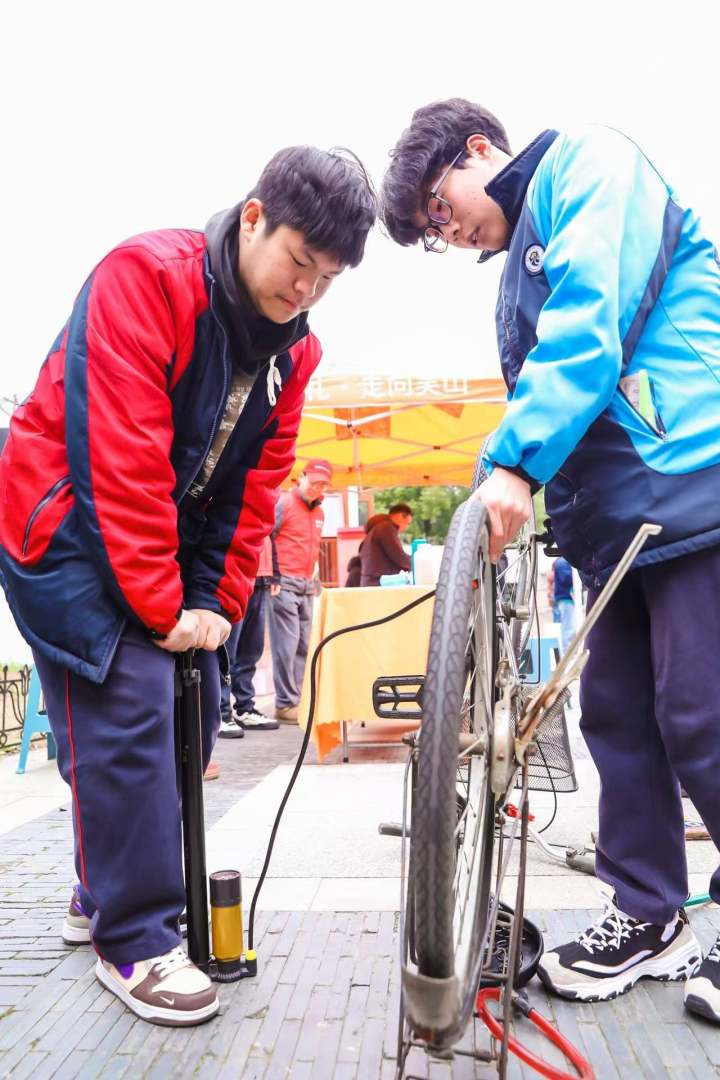孔胜东带着杭州市交通作事高档中学的4位学生志愿者,全部修理眼前的5辆自行车。