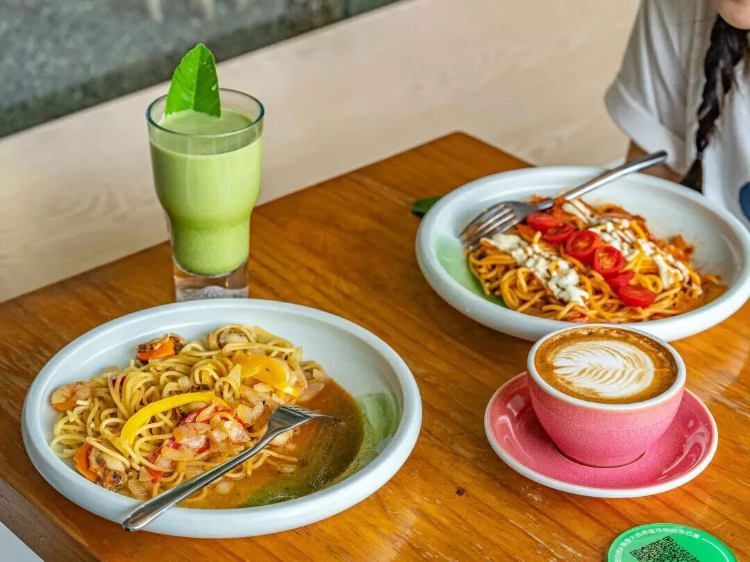 咖啡+简餐的复合式好意思学空间,二楼自带孤高露台。夏令为止“蓝沙”咖啡颜值高,意粉也可以。
