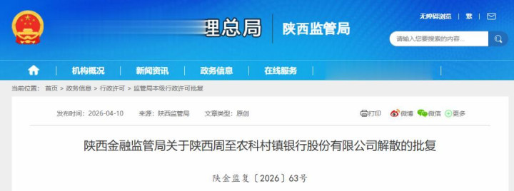 《对于落幕陕西周到农科村镇银行股份有限公司的文告》(周村银〔2026〕30号)收悉。经审核,现批复如下: