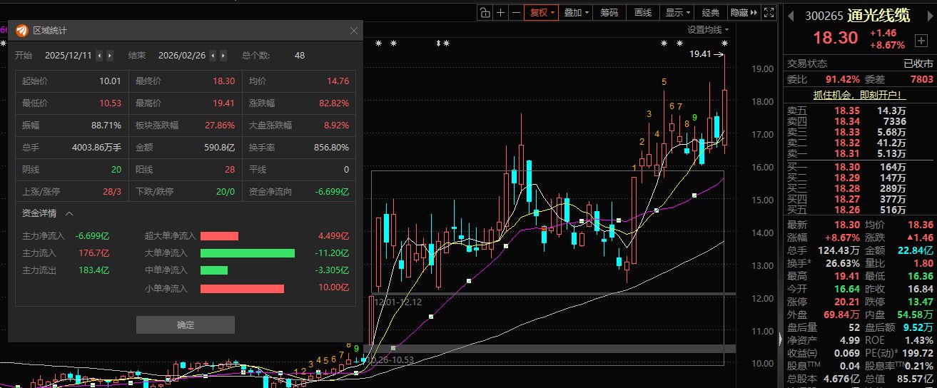 如将时辰线拉长,2025年12月11日至2026年2月26日收盘,通色泽缆在48个来去日内大涨82.82%,远超同时大盘8.92%的累计涨幅。本事,通色泽缆累计成交590.8亿元,累计换手率达856.8%。