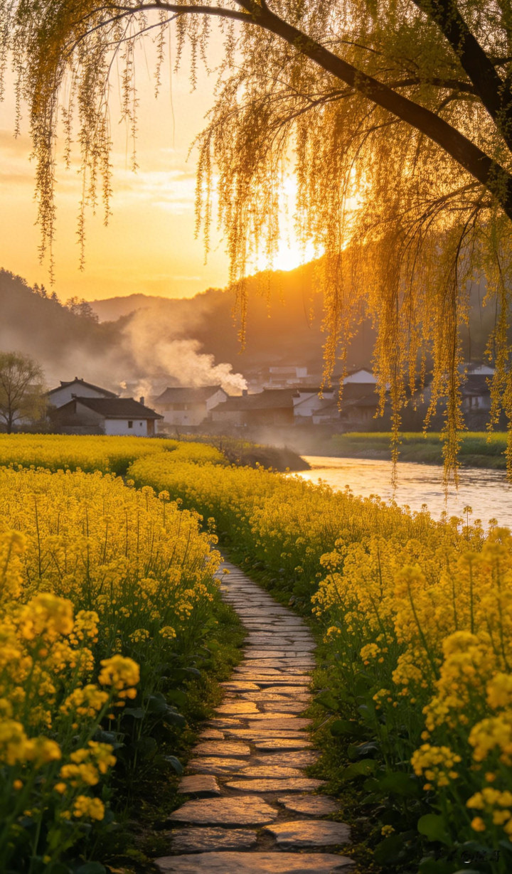 远山、村庄、花田、垂柳,在落日余光中组成一幅绝好意思的水墨画卷,好意思得让东谈主快慰。